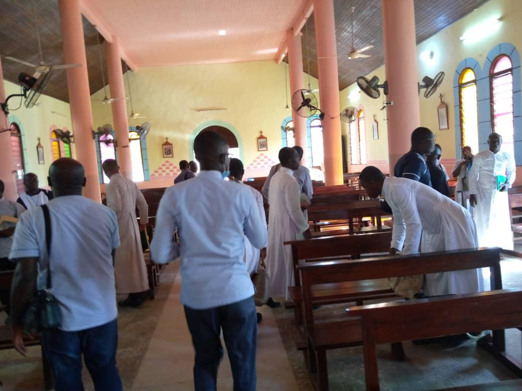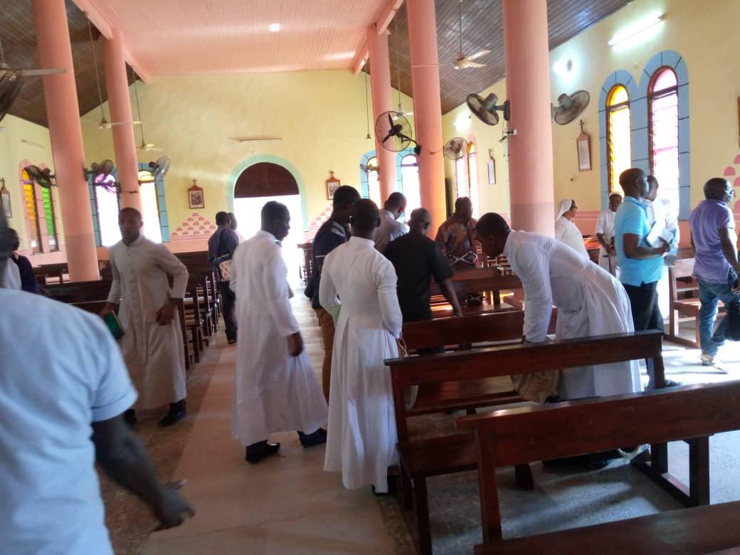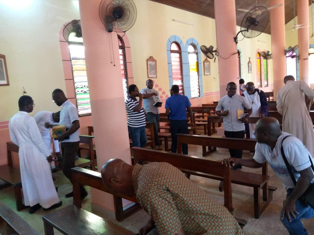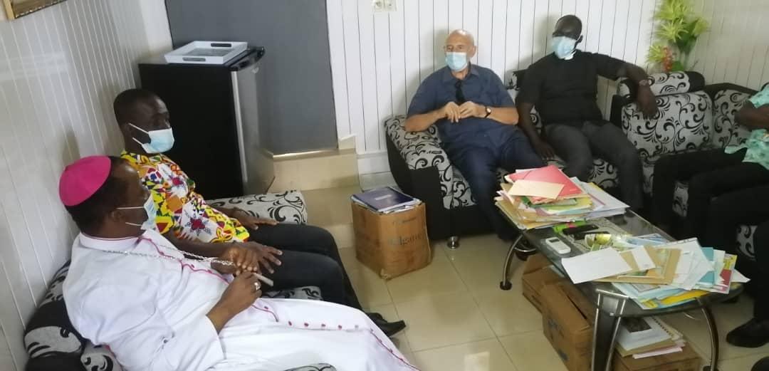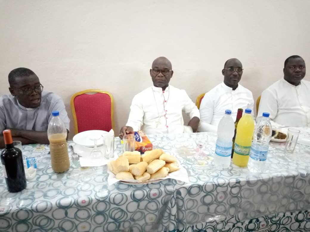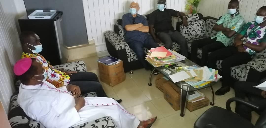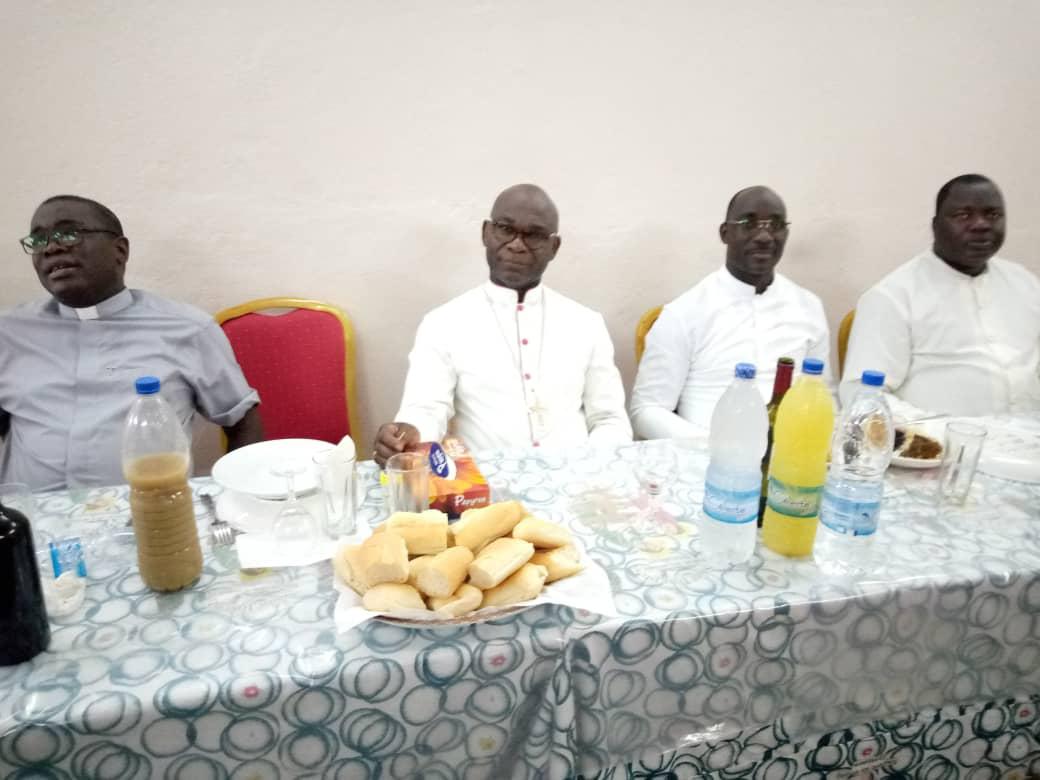 Rencontre entre notre très cher père évêque monseigneur Raymond, le vicaire général, le secrétaire de l'évêque et les agents pastoraux des secteurs Maferé-Aboisso. Lundi 23 novembre à St François Xavier d'Aboisso.