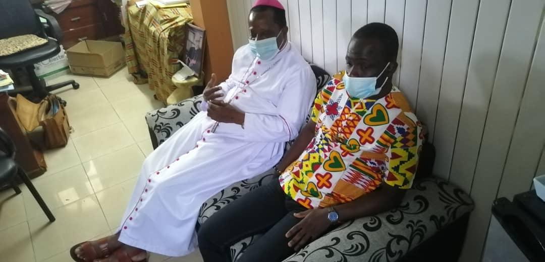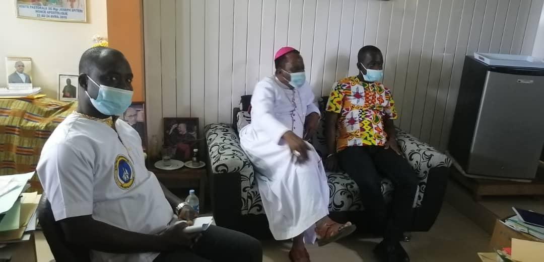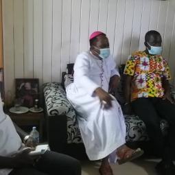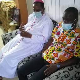 La communauté de OFFA et celle du Noviciat en visite chez l'ordinaire du lieu monseigneur Alexis TOUABLY.